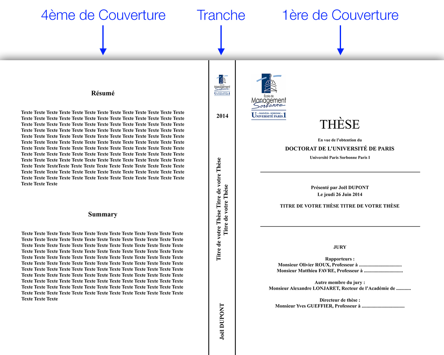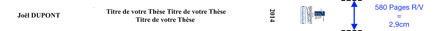 Les dimensions des pages de votre fichier PDF doivent être de 21x29,7cm (Soit en format A4) hormis votre marque-page qui devra être d'une dimension inférieure au A4 tout en restant lisible (exemple: 15x21cm). La tranche est l'épaisseur de votre thèse, c'est-à-dire la partie intermédiaire entre la 1ère et la 4ème de couverture : Remarque : vous n'avez ni à dessiner les traits verticaux de l'image ci-dessous ni à parfaitement mettre en forme la tranche: le graphiste d'impression-these s'en charge !